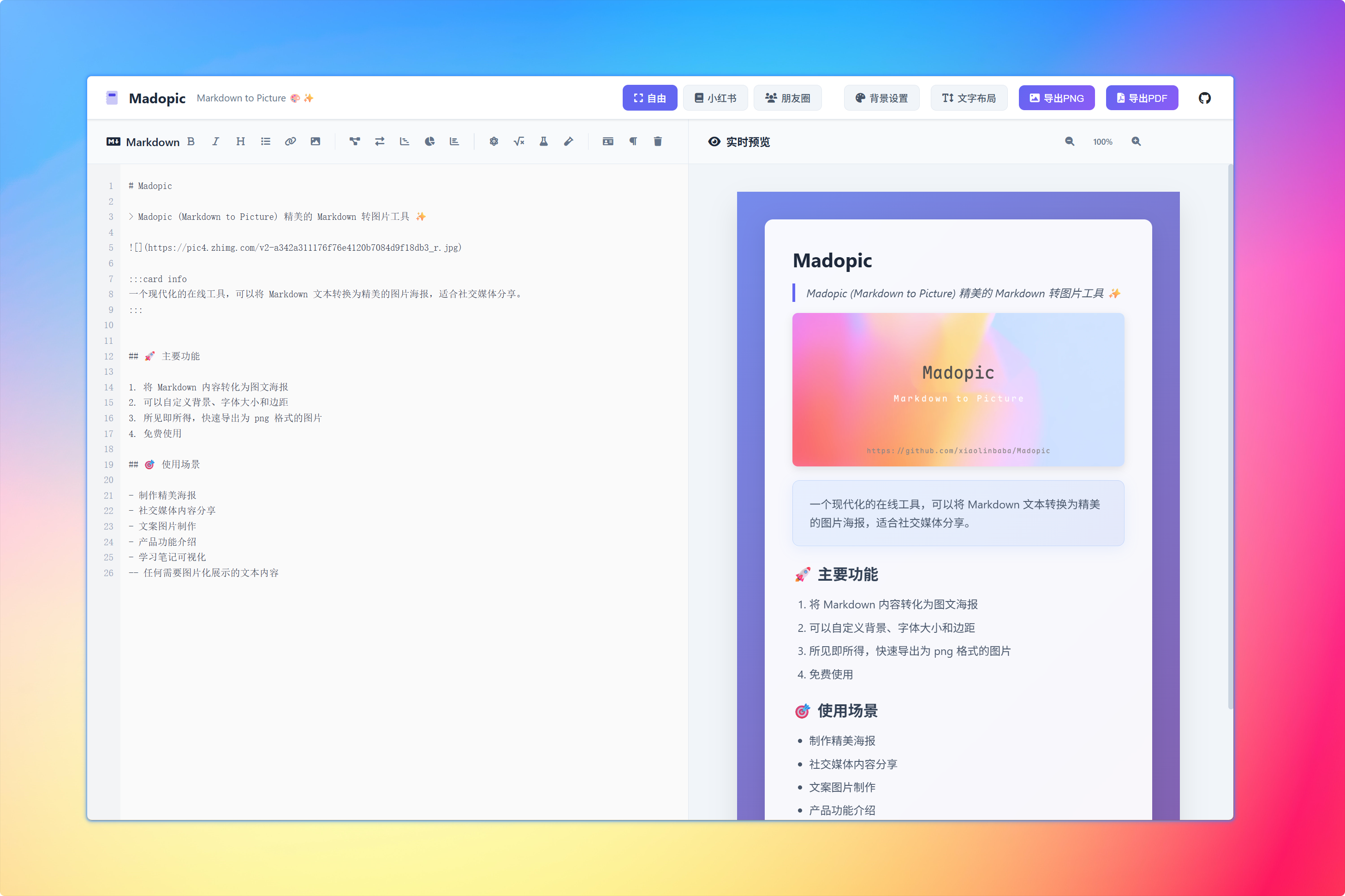 # Madopic > Madopic,精美的 Markdown 转图片工具 🎨  :::card info 一个现代化的在线工具,可以将 Markdown 文本转换为精美的图片海报,适合社交媒体分享。 ::: ## 🚀 主要功能 - 将 Markdown 内容转化为图文海报 - 可以自定义背景、字体大小和边距 - 所见即所得,快速导出为 png 图片,pdf 文档 - 支持本地图片,粘贴图片,网络图片 - 支持 Mermaid,Echarts,数学公式,信息卡片等元素 ## 🎯 使用场景 - 社交媒体,制作精美海报,信息卡片 - 教育学习,教学课件,知识卡片 - 商业应用,技术文档,架构图,数据展示 - 学术科研,复杂公式,专业图表展示 - 任何需要图片化展示的富文本内容